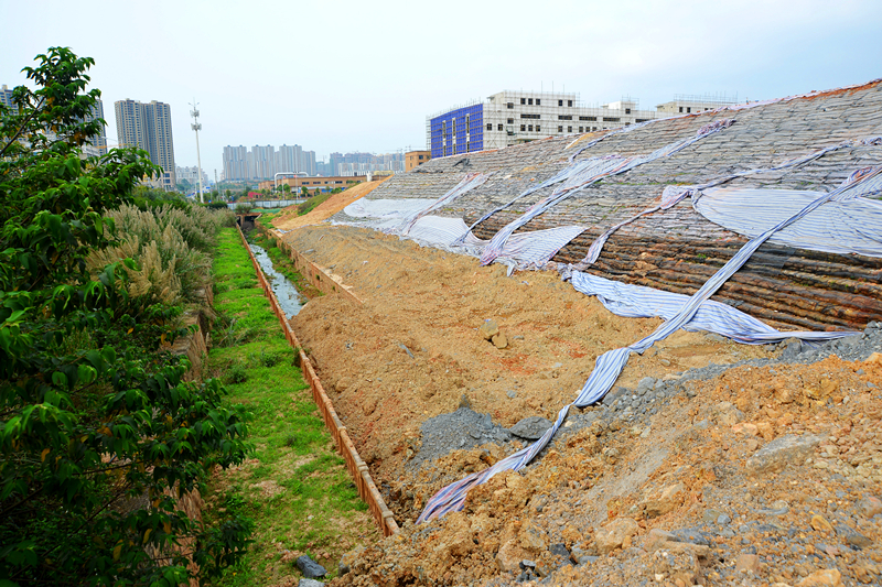 中恒邊坡整治工程于2015年7月26日開始進(jìn)場(chǎng)施工建設(shè),合同工期為60天。該邊坡治理工程長(zhǎng)度為270米,項(xiàng)目總投資為275萬(wàn)元。主要以土工格柵為主體結(jié)構(gòu)進(jìn)行支護(hù),對(duì)邊坡及滑坡主體進(jìn)行治理,輔助工程有:排水設(shè)置和清理坡面。主要工程量有:土方開挖運(yùn)輸7.5萬(wàn)立方,土方回填壓實(shí)7萬(wàn)立方,填土土工格柵鋪設(shè)12.6萬(wàn)平方米,壓腳墻長(zhǎng)度220米,整個(gè)項(xiàng)目邊坡的填土高度平均為16米。