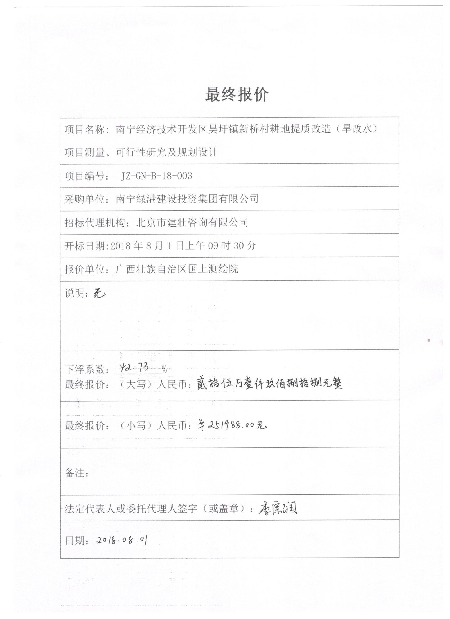 北京市建壯咨詢有限公司受南寧綠港建設(shè)投資集團(tuán)有限公司委托,根據(jù)《中華人民共和國政府采購法》等有關(guān)規(guī)定,于2018年8月1日就南寧經(jīng)濟(jì)技術(shù)開發(fā)區(qū)吳圩鎮(zhèn)新橋村耕地提質(zhì)改造(旱改水)項(xiàng)目測(cè)量、可行性研究及規(guī)劃設(shè)計(jì)以競爭性磋商方式進(jìn)行采購,現(xiàn)就本次采購的成交結(jié)果公告如下: