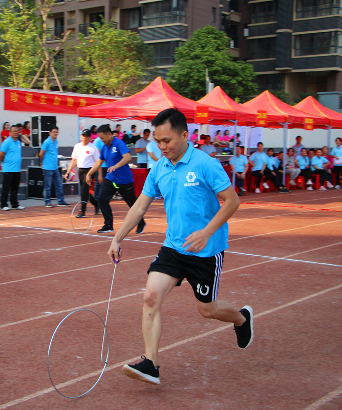《滾鐵環(huán)》(科巨公司 盧艷芳)圖片說(shuō)明:2019年綠港集團(tuán)”團(tuán)結(jié)杯“運(yùn)動(dòng)會(huì)上,職工們參加趣味項(xiàng)目滾鐵環(huán)