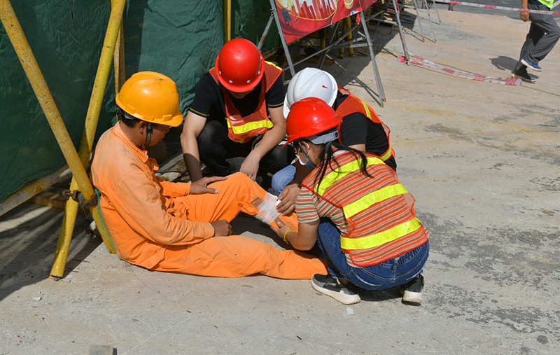現(xiàn)場模擬一名工人在2#、3#廠房間的廊架上進(jìn)行施工作業(yè)時(shí),因未系安全帶、腳下未踩穩(wěn)造成高處墜落受傷,其他人員對其進(jìn)行急救的情況。從發(fā)現(xiàn)人員墜落受傷、疏散人群、封鎖現(xiàn)場到對受傷人員骨折部位用夾板進(jìn)行固定再送至醫(yī)院,僅歷時(shí)10分鐘。整個(gè)過程緊張有序,應(yīng)急處理得當(dāng)。演練中,現(xiàn)場每名救援人員嚴(yán)肅認(rèn)真對待每個(gè)演練細(xì)節(jié)。各應(yīng)急小組聞聲而動,各司其職,反應(yīng)迅速,各環(huán)節(jié)無縫銜接,使救援任務(wù)得以順利完成。