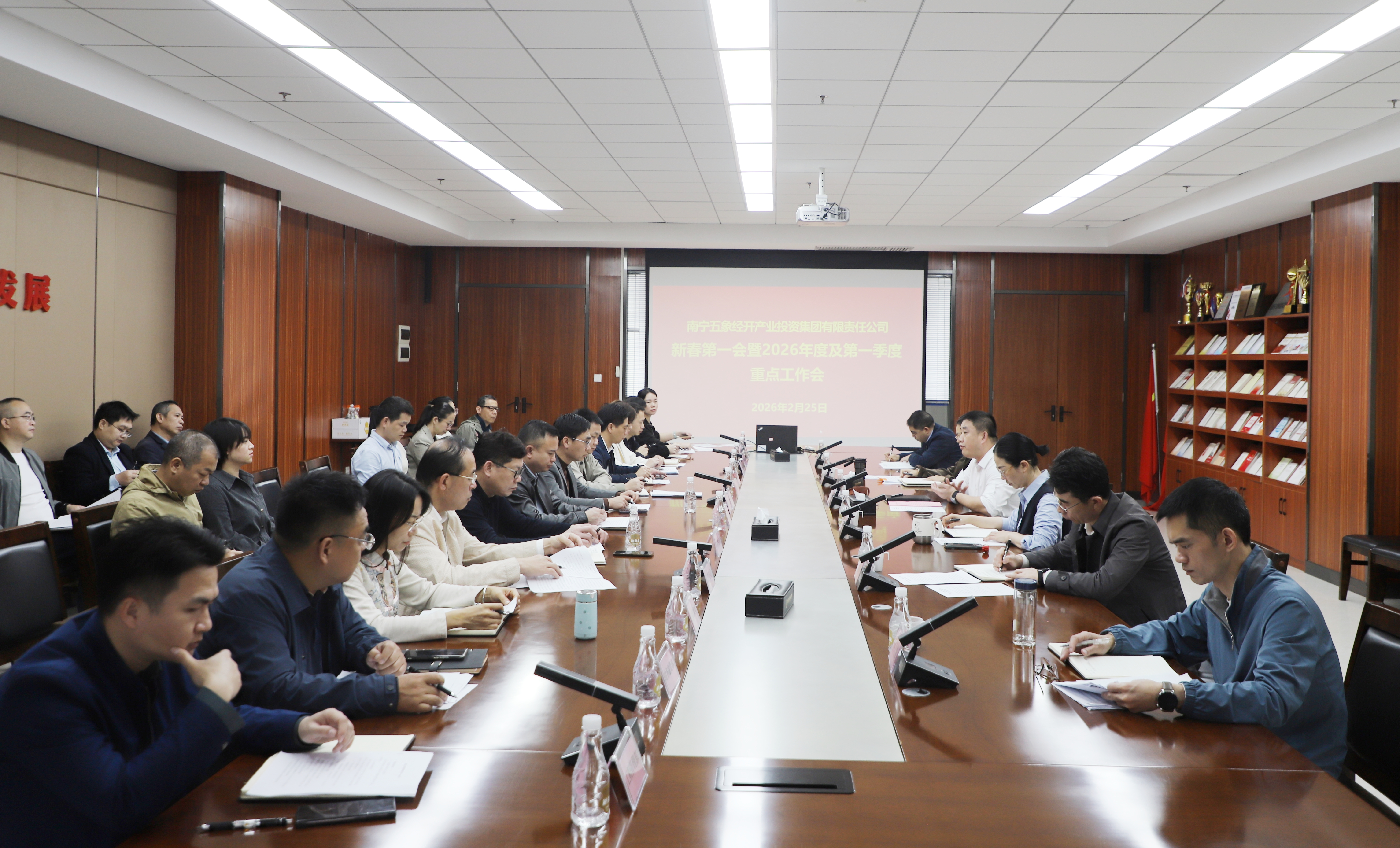 一年春作首,萬事干為先。2月26日上午,五象經(jīng)開產(chǎn)投集團(tuán)組織召開2026年新春第一會(huì),深入貫徹落實(shí)自治區(qū)、南寧市、五象新區(qū)2026年“新春第一會(huì)”會(huì)議精神,系統(tǒng)分析集團(tuán)公司發(fā)展現(xiàn)狀,研究部署2026年及一季度重點(diǎn)工作,動(dòng)員全集團(tuán)上下統(tǒng)一思想,明確工作目標(biāo),全力以赴拼經(jīng)濟(jì)、抓落實(shí)、促發(fā)展,全面化解歷史矛盾,全力促進(jìn)安全穩(wěn)定,奮力爭取一季度開門紅,為全年破局突圍筑牢基礎(chǔ)。集團(tuán)黨委書記、董事長羅祥濤主持會(huì)議并講話,集團(tuán)領(lǐng)導(dǎo)班子、中層副職以上管理干部及各子公司班子成員參加會(huì)議。